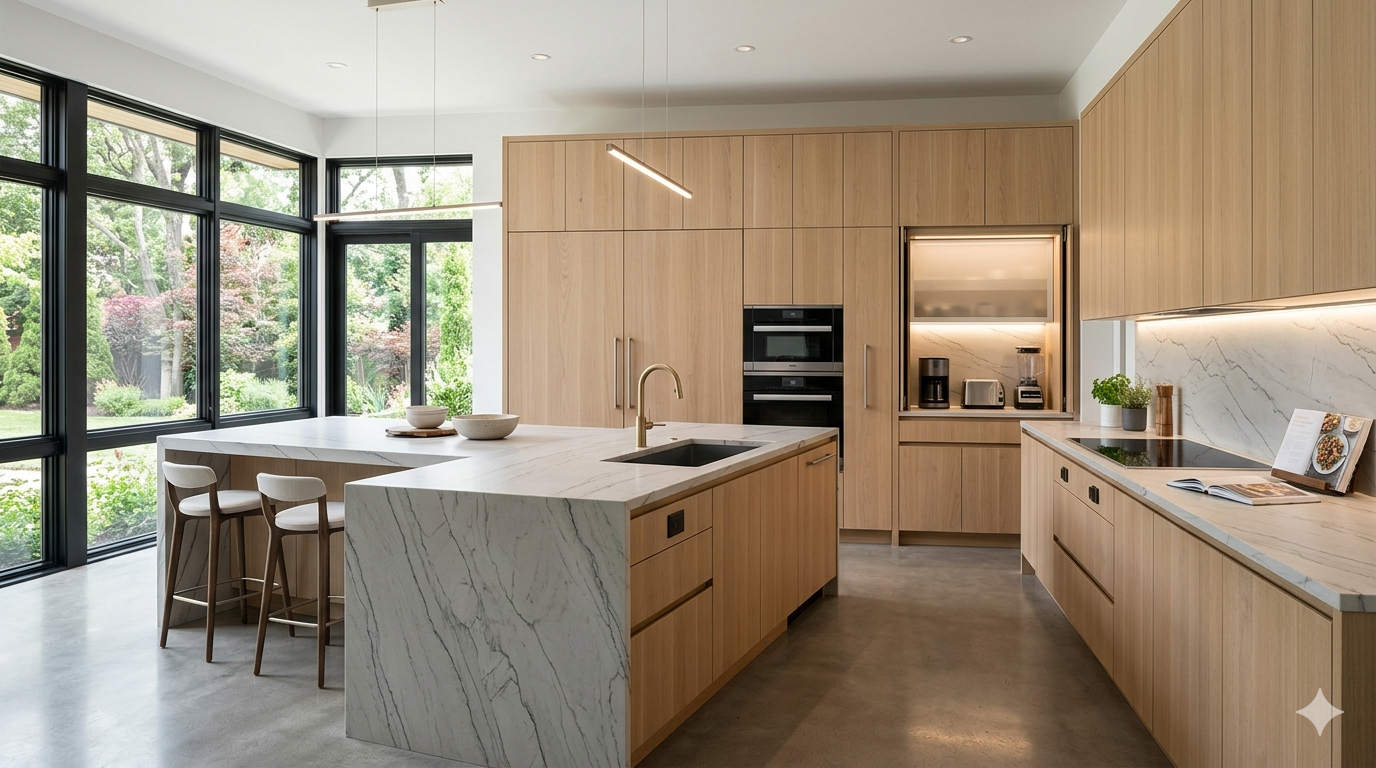 While granite was the king of the early 2000s, today’s high-value kitchens prioritize engineered quartz and porcelain slabs. These materials offer the stunning veining of Calacatta marble without the porous vulnerability. A major trend for 2026 is the “Waterfall Island,” where the countertop material cascades down the sides to the floor, creating a monolithic, sculptural centerpiece.